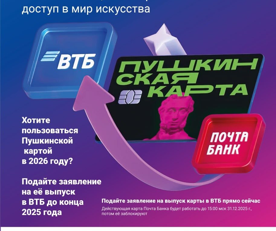 С 1 января 2026 года банком-оператором программы «Пушкинская карта» станет банк ВТБ.