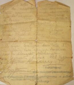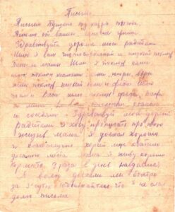 Привет с фронта дорогим родным и знакомым. Во первых строках передаю свой низкий приветь и с горячей любовью. Дорогие родные. Я хочу вам сообщить о том, что я еще жив и здоров, чего и вам желаю, мама, Таня, Клава и братец Юра.