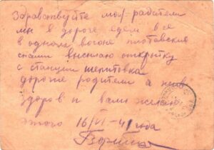 Здравствуйте, мои родители. Мы в дороге едем все в одном вагоне, плотавские с нами. Высылаю открытку с станции Шепитовка.