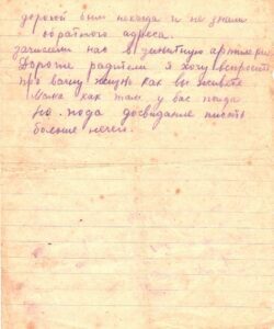 Мама, я доехал хорошо и благополучно. Харчей мне хватило до самого места. Мама, я живу хорошо. Кормють 3 раза в день, наедаемся вволю. Доехали мы быстро, за 3-е суток. Не обижайтесь, что я не слал долго письма, дорогой было некогда и не знали обратного адреса. Зачислили нас в зенитную артиллерию.